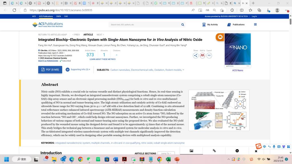 成果题目为“Integrated biochip-electronic System with single-atom nanozyme for in vivo analysis of nitric oxide”,胡芳馨副教授为第一兼通讯作者,郭春显教授、杨鸿斌教授为通讯作者。该工作设计和构筑了单原子钴纳米酶集成的纳米电子传感芯片系统,实现了小鼠活体内多种器官及体外释放生物信号分子一氧化氮的多重分析。该集成系统弥补了单一生物传感器与活体体外和体内分子分析集成系统之间的技术差距,为全集成纳米电子传感系统在临床上的应用提供了有效支撑。