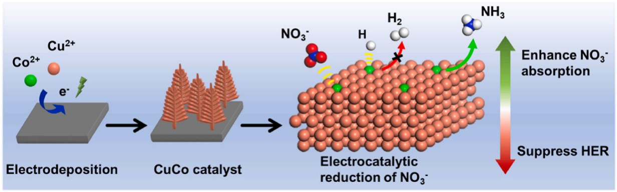 该研究成果开发了一种双金属铜钴纳米晶,实现了在中性电解质中100%的硝酸盐转化率,并在−0.65 V vs. RHE下保持了95%的法拉第效率。更重要的是,它的高催化活性可以使硝酸盐转化为氨的转化率达到97%以上。根据密度泛函理论计算表明,其良好的催化活性来源于钴的引入增强了铜催化剂对硝酸根吸附,并能够有效抑制了析氢反应。本研究为开发高活性和选择性的NRA电催化剂提供了新的思路。
