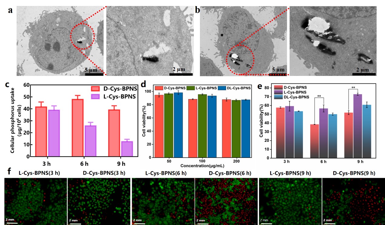 另一方面,为解决BPNS在生理环境中代谢降解迅速、胞内积累量少的问题,我们首次提出了一种基于氨基酸表面功能化的手性BPNS及其用于手性依赖的肿瘤光疗。经不同手性的半胱氨酸(Cys)修饰,获取了相应的D, L, DL-BPNS。经表征,不同手性的BPNS在结构组成、微观形貌尺寸、光敏剂活性与光热性能上基本一致,但在细胞内则显示出手性依赖的抗肿瘤活性,其中D型BPNS的细胞毒性比L型大约高3倍。经生物学电镜与细胞内元素含量的跟踪监测,发现D型BPNS具有更高的胞内累积量以及更慢的降解速率。在对皮下荷瘤小鼠体内应用后,同样展示出与细胞水平近似的手性依赖的肿瘤治疗效应。这极有可能与不同手性BPNS与磷脂膜界面存在手性依赖的识别和相互作用过程有关。该工作首次揭示了BPNS在肿瘤光疗中的手性依赖行为,为光疗纳米剂的开发提供了新途径,也拓展了手性纳米医学的研究思路。(Chen Bo, Li Changming*, Guo Chunxian* et al. Chirality-dependent tumor phototherapy using amino acid-engineered chiral phosphorene. ACS Applied Materials & Interfaces, 2022, accept. 中科院2区,IF 10.38)