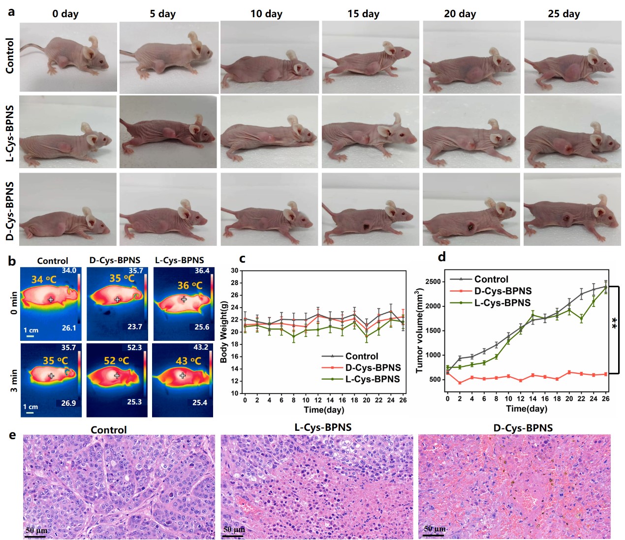 图7 手性氨基酸功能化黑磷细胞对皮下荷瘤小鼠的手性依赖性抗肿瘤效应的评价