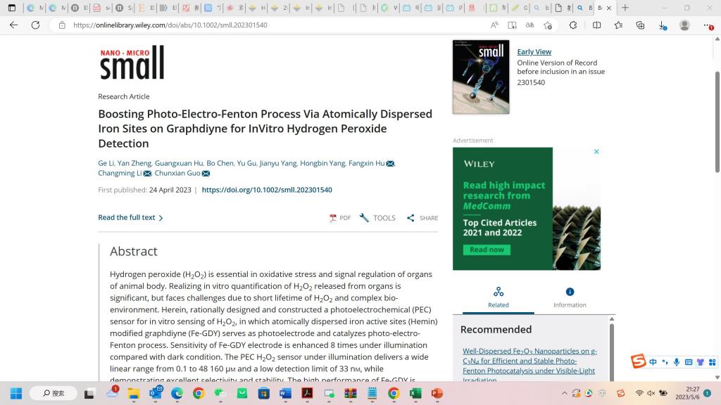 近日,公司生化传感团队在《Small》 (IF: 15.153) 期刊上发表论文,题目为 “Boosting Photo-Electro-Fenton Process Via Atomically Dispersed Iron Sites on Graphdiyne for in Vitro Hydrogen Peroxide Detection”。研究生李鸽为第一作者,胡芳馨副教授、李长明教授、郭春显教授为共同通讯作者。