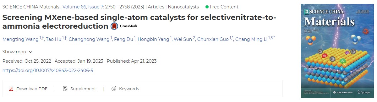 Meng Ting Wang, Tao Hu, Chun Xian Guo, and Chang Ming Li. "Screening MXene-based single-atom catalysts for selective nitrate-to-ammonia electroreduction", SCIENCE CHINA Materials (2023) 66: 2750-2758.