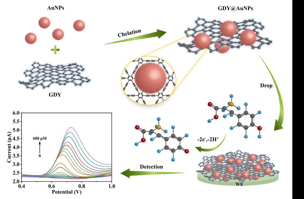 酪氨酸(Tyr)是一种调节情绪和刺激神经系统的氨基酸,实现其超灵敏检测具有重要意义。该研究成果设计并开发了一种独特的石墨炔螯合AuNPs的传感材料(GDY@AuNPs),AuNPs均匀地锚定在GDY上,GDY与AuNPs螯合后部分C≡C键断裂,使得AuNPs缺电子,实现了对Tyr的高效催化氧化。GDY通过π-π相互作用促进对Tyr的吸附,且其C≡C与AuNPs间的强螯合作用,大大提高了传感器的灵敏度,并展示了优异的选择性和稳定性。该GDY@AuNPs传感器的灵敏度高达181.2 μA mM−1 cm−2,线性范围较宽为0.1-600 μM,且检出限低至0.1 μM。传感器储存5周后仍能保持91.9%的初始电流响应,具有良好的贮存稳定性,并成功实现了对人体汗液中Tyr的高灵敏检测,具有潜在的实际应用价值。