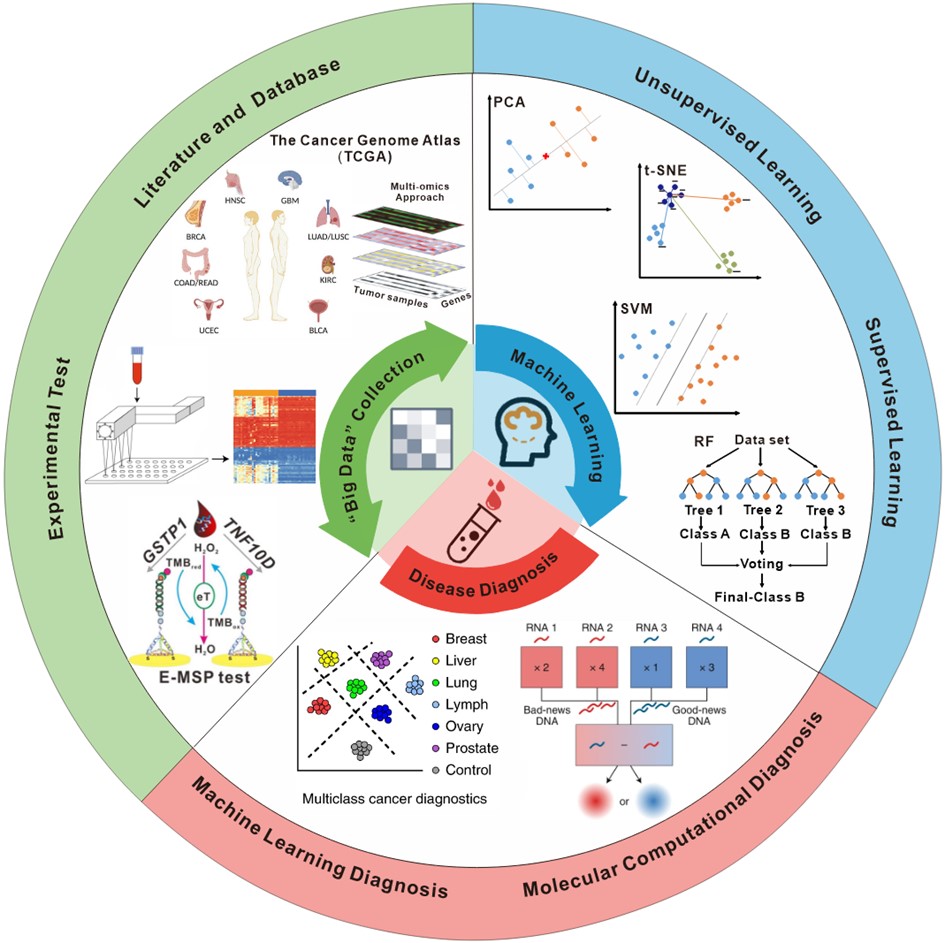 探索准确、无创和廉价的疾病诊断传感器是化学、生物学和医学领域的一项关键任务。生物系统的复杂性和生物标志物数据的爆发性增长,使机器学习成为从疾病诊断传感器中挖掘和处理大数据的强大工具。随着生物信息学和人工智能(AI)的发展,由数据挖掘形成的机器学习模型已经能够指导更加敏感和准确的分子计算。本文综述了大数据收集方法和基本的机器学习算法,并讨论了机器学习和分子计算在疾病智能诊断传感器的最新进展。强调了现有的模块化工作流程,以及机器学习通过大数据挖掘来实现疾病诊断的关键机遇和挑战。