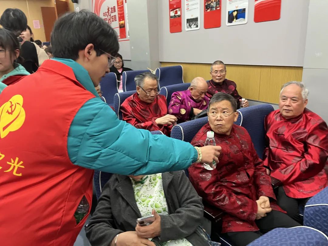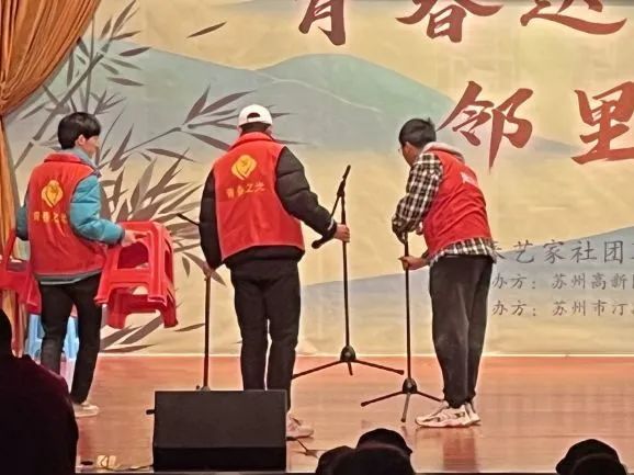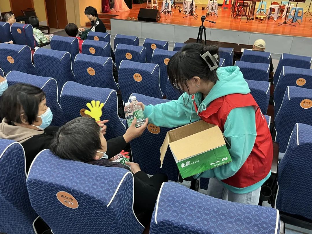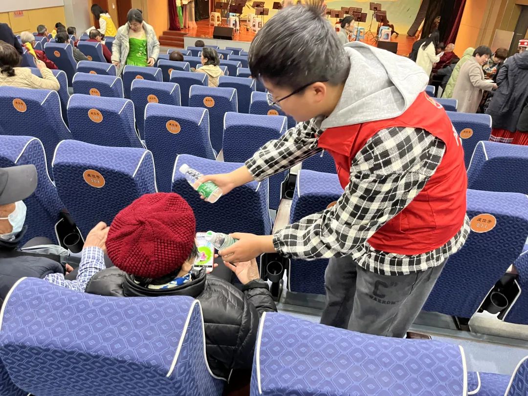 第一组同学负责会场的人员登记,引导社区观众在登记表上签名,记录到场人数,完成统计工作。第二组同学负责引导观众落座、为观众提供免费的矿泉水、维护现场秩序。第三组同学负责舞台道具的布置。他们在节目组老师的指挥下,有条不紊地完成节目中所需道具的布置,确保各个节目能顺利完成、节目之间可以顺畅衔接。
