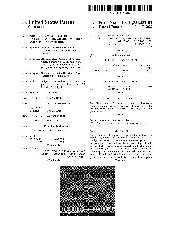 近日,公司陈志刚教授团队申请的国际发明专利“Photocatalytic composite material and preparation method and application thereof”(光催化复合材料及其制备方法和应用)喜获美国发明专利授权(授权号:US11351532B2)。此次国际发明专利的授权,标志着公司原创性科学研究取得了新突破。