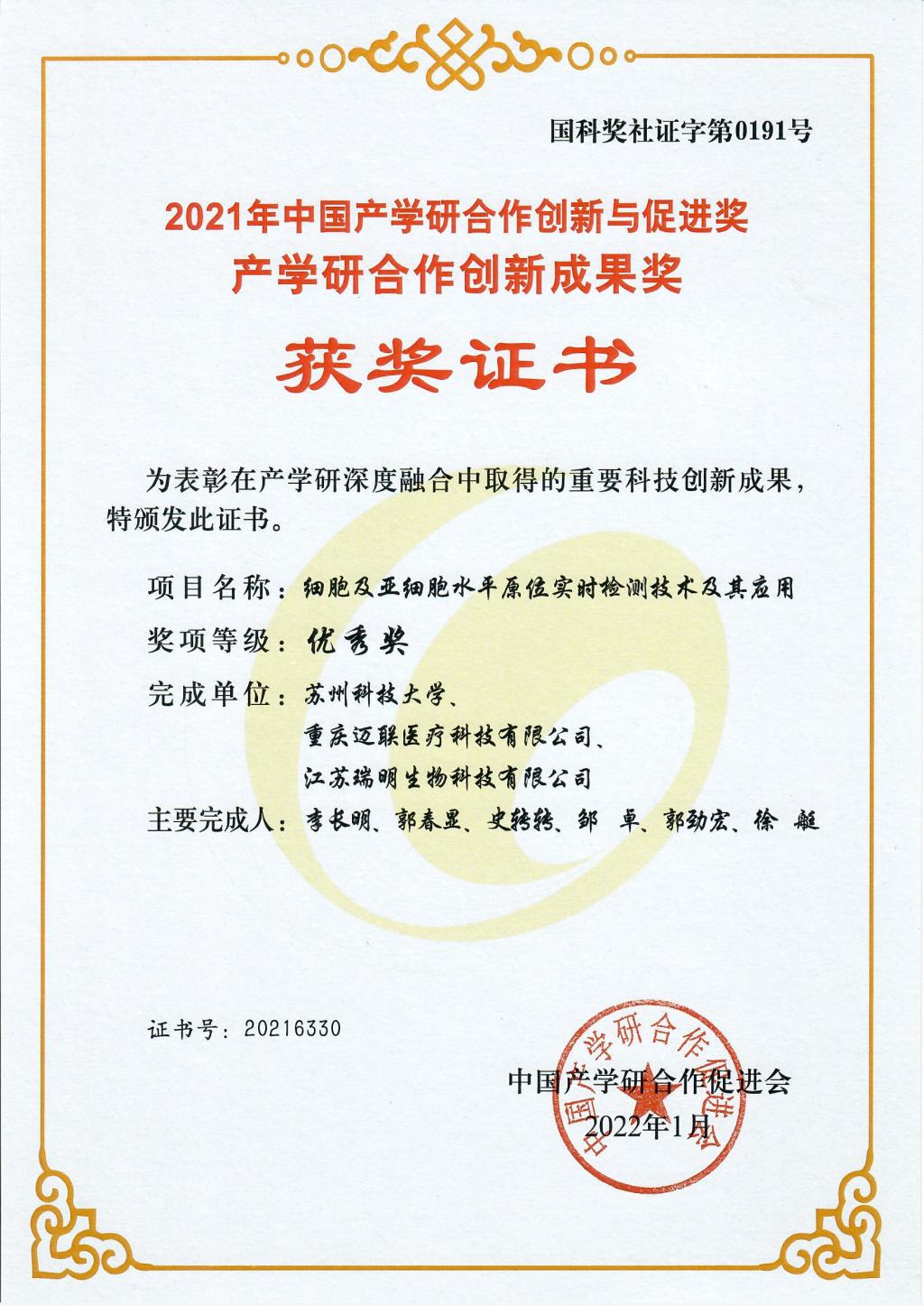 近日,中国产学研合作促进会公布了2021年产学研合作与促进奖的表彰决定,由云顶国际yd222线路检测中心为第一完成单位,公司李长明教授团队为主导,联合重庆迈联医疗科技有限公司和江苏瑞明生物科技有限公司共同完成的成果“细胞及亚细胞水平原位实时检测技术及其应用”获得中国产学研合作创新成果奖优秀奖。