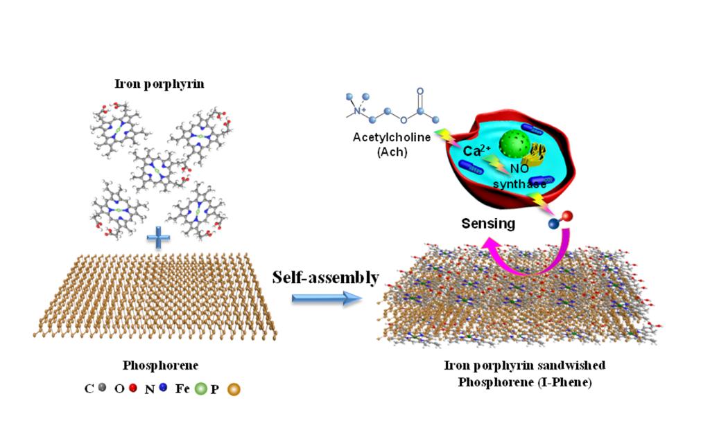 该研究成果设计了一种三明治结构的磷烯复合材料,增强磷烯的稳定性,磷烯表面由铁卟啉单分子层保护,稳定性得到极大的提升, I-Phene能够在空气环境保存40天以上。与此同时,单分子层内的Fe成为了活跃的催化中心,能够更灵敏地检测一氧化氮。I-Phene对NO的响应强度是单独磷烯和铁卟啉的2.5倍和4.0倍。I-Phene在0.82 V的低氧化电位下实现了0.02-683.65 mM的宽检测范围和6 nM的低检测限,并实现了原位检测细胞释放的NO。这种超薄单分子层保护的磷烯三明治结构有利于提升材料的稳定性及其电化学传感性能,拓宽磷烯的应用范围,推动磷烯在细胞原位检测的研究进程。