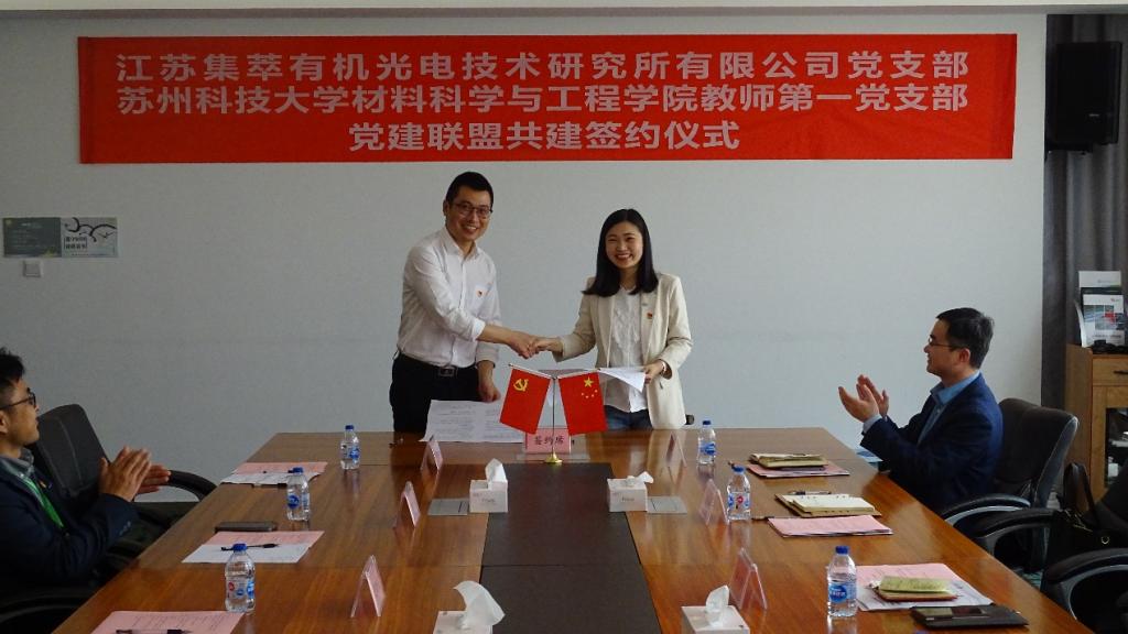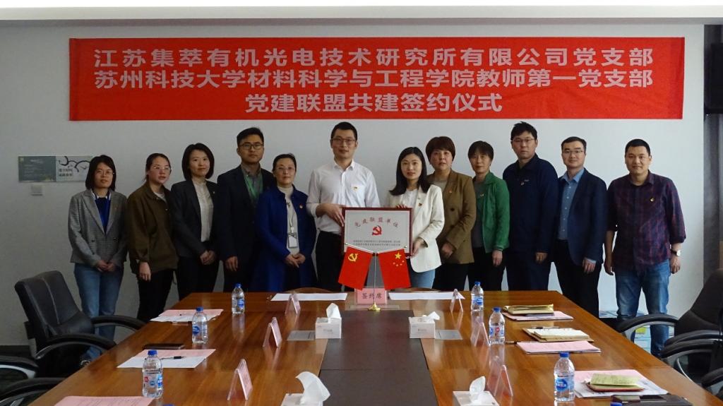 4月27日,云顶国际yd222线路检测中心教师第一党支部与集萃有机光电所党支部在江苏集萃有机光电技术研究所有限公司举行了“光电转化材料研发、测试共享平台”党建联盟签约仪式。公司党总支书记和洁、党总支副书记/副经理李永丹、副经理叶常青、教师第一支部党员参加了此次活动。